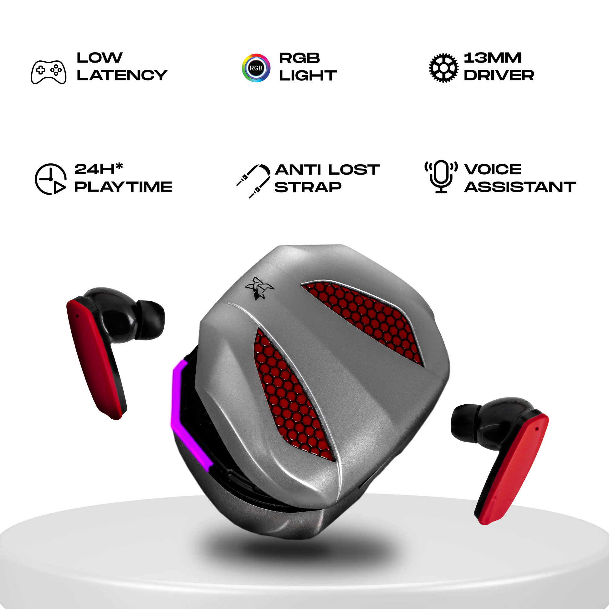 | Controls | On ear touch control (Gaming mode, Volume, Music, Call control feature on both earbuds, Siri and Google Assistant) |